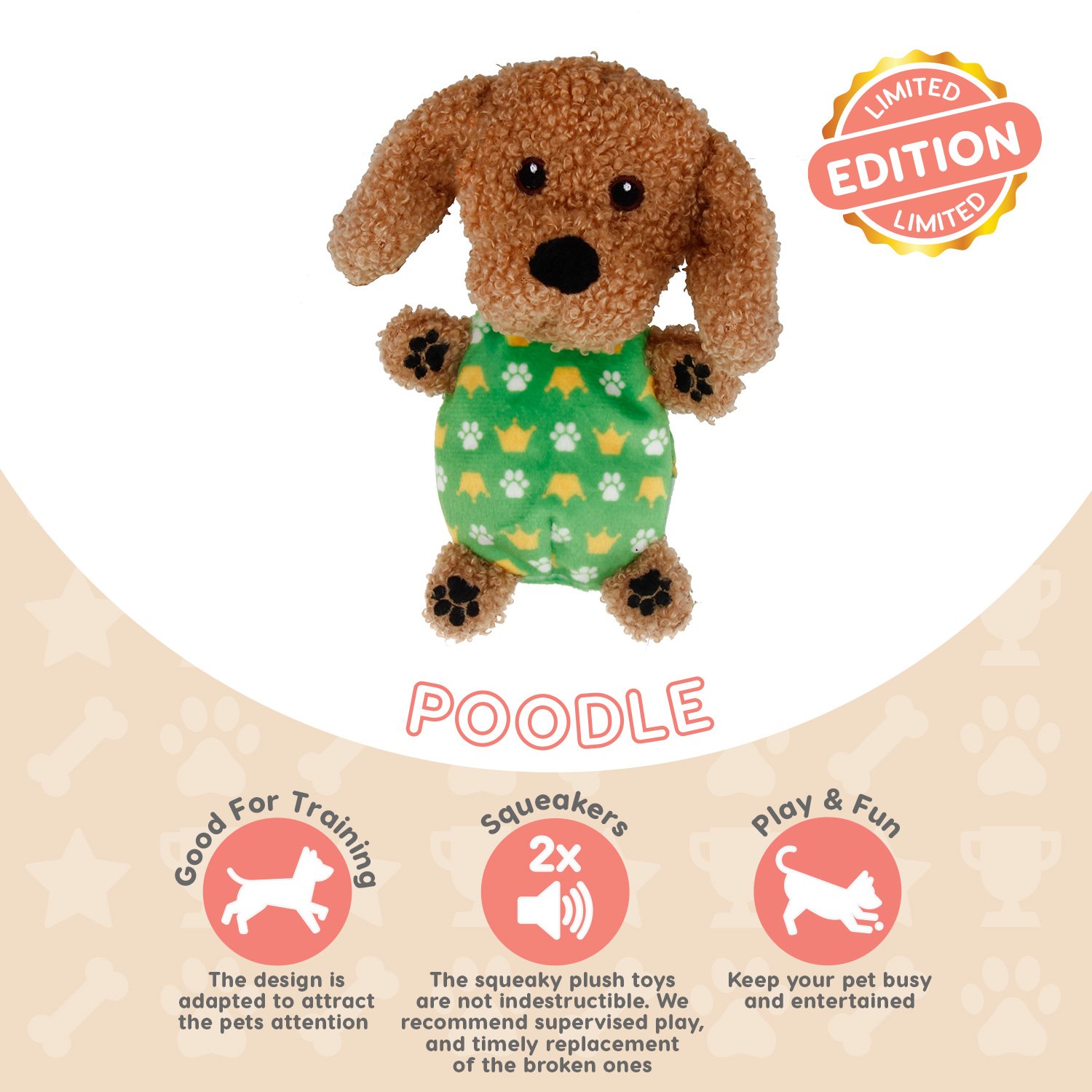 šis žaislas pasiūtas pagal animuotą pudelio pavyzdį, todėl atrodo smagiai, gali atitikti ir Jūsų augintinio veislę! Žaisliuko pilvukas ryškiai oranžinės spalvos, kuri dar labiau patraukia augintinio dėmesį.