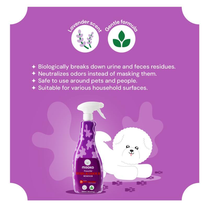MISOKO Lavender Spray with PRO-BACTERIA™ formula biologically neutralizes dog odors and stains. Safe for children and pets, perfect for daily use at home.