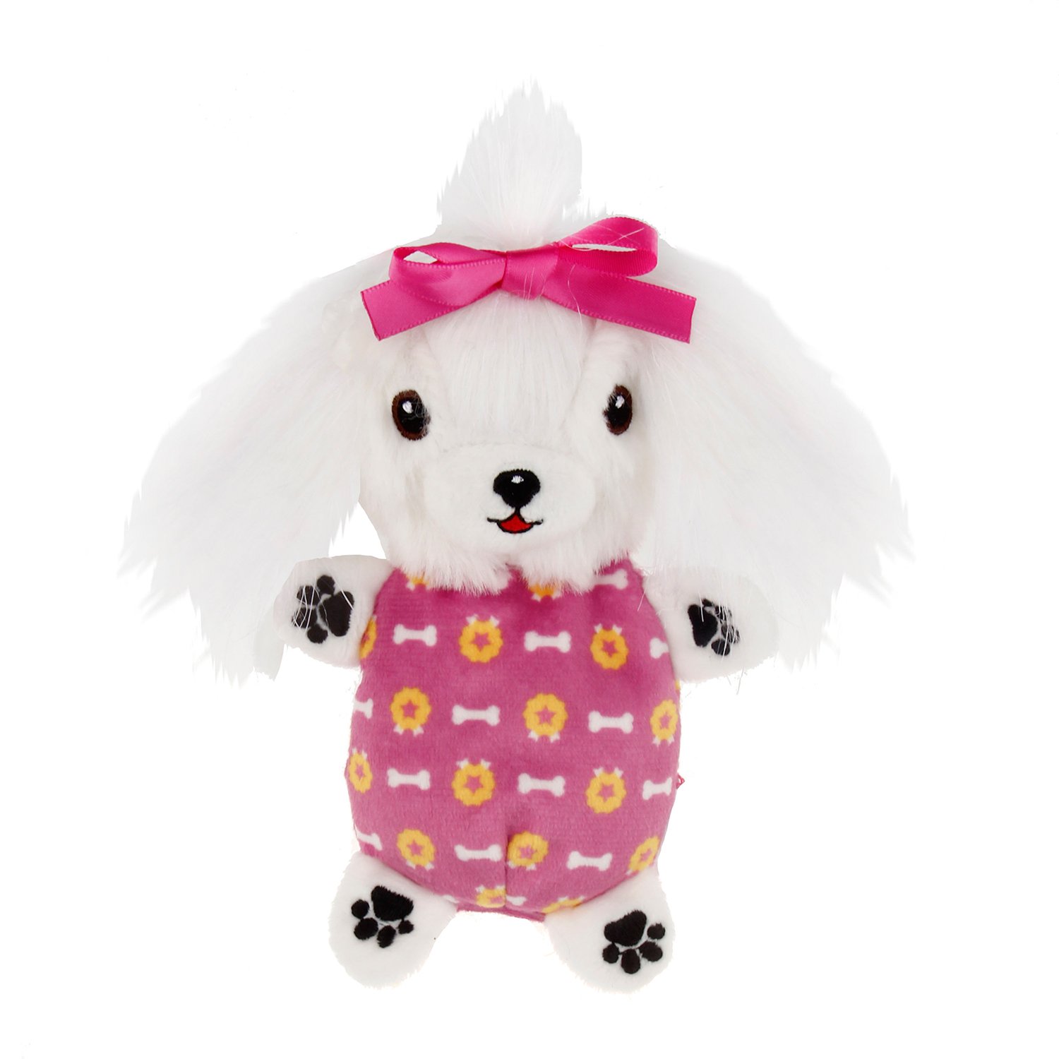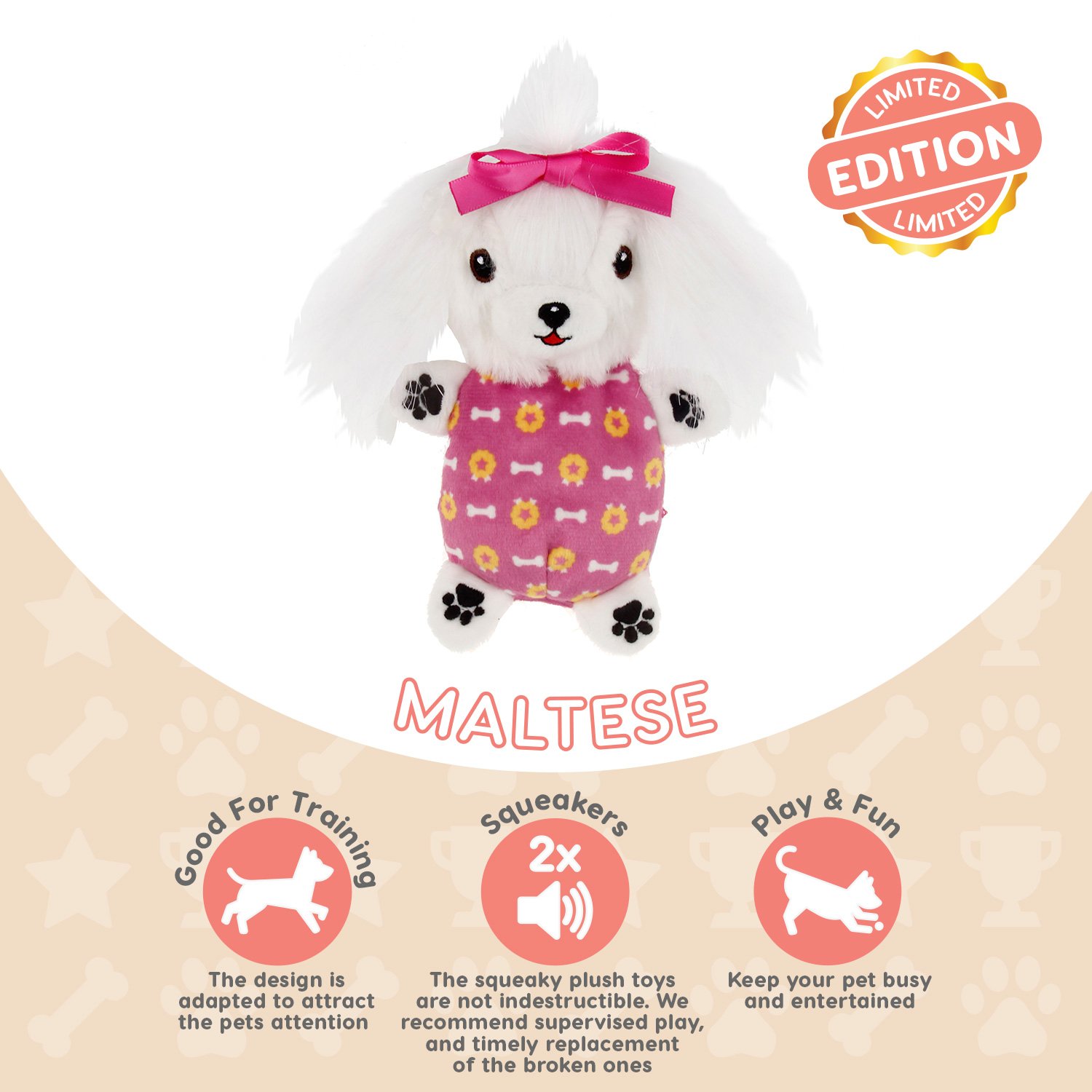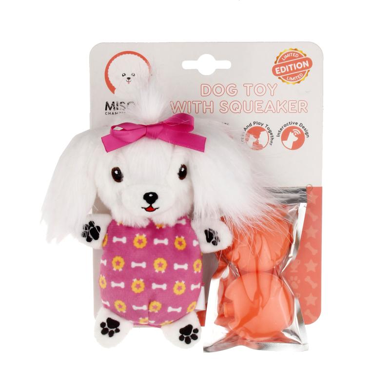 Squeaking: A squeaky pillow can be placed on the back of the plush Maltese Bichon (there are two in the set). Sound-emitting toys help keep your pet’s attention longer during play.